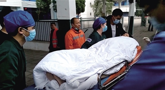 在江西信豐站臨時(shí)??績煞昼?,大家協(xié)力將產(chǎn)婦和新生兒抬到120急救車上,送往醫(yī)院進(jìn)一步治療。(圖片由劉晶新提供)