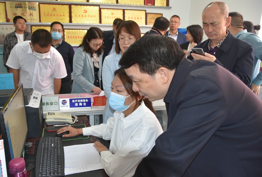 在包頭市青山區(qū)自由路街道基層醫(yī)保服務站,調研組觀摩了站里三級幫辦、四色戶卡分類、五種方式厚植服務等便民欄,查看了咨詢引導區(qū)、休息等待區(qū)、窗口受理區(qū)、便民服務區(qū)和自助服務區(qū)各項經(jīng)辦業(yè)務的開展情況等。