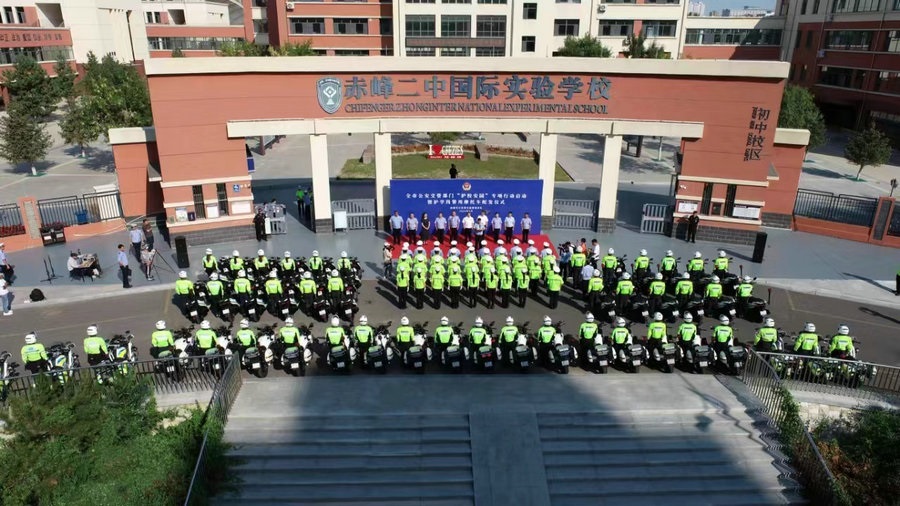 北疆新聞呼和浩特9約3日電(記者 楊凈毓)8月30日,赤峰市公安局交管支隊在赤峰二中國際實驗學(xué)校門前,舉行全市公安交管部門“護(hù)校安園”專項行動啟動暨護(hù)學(xué)崗警用摩托車配發(fā)儀式。