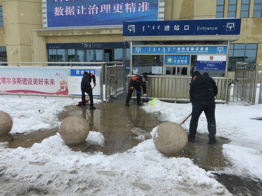 4月3日,受極端惡劣天氣影響,鄂爾多斯市東勝東車站派出所轄區(qū)內連降雨夾雪,車站進出站口積雪、積水嚴重,給旅客群眾出行帶來不便。
