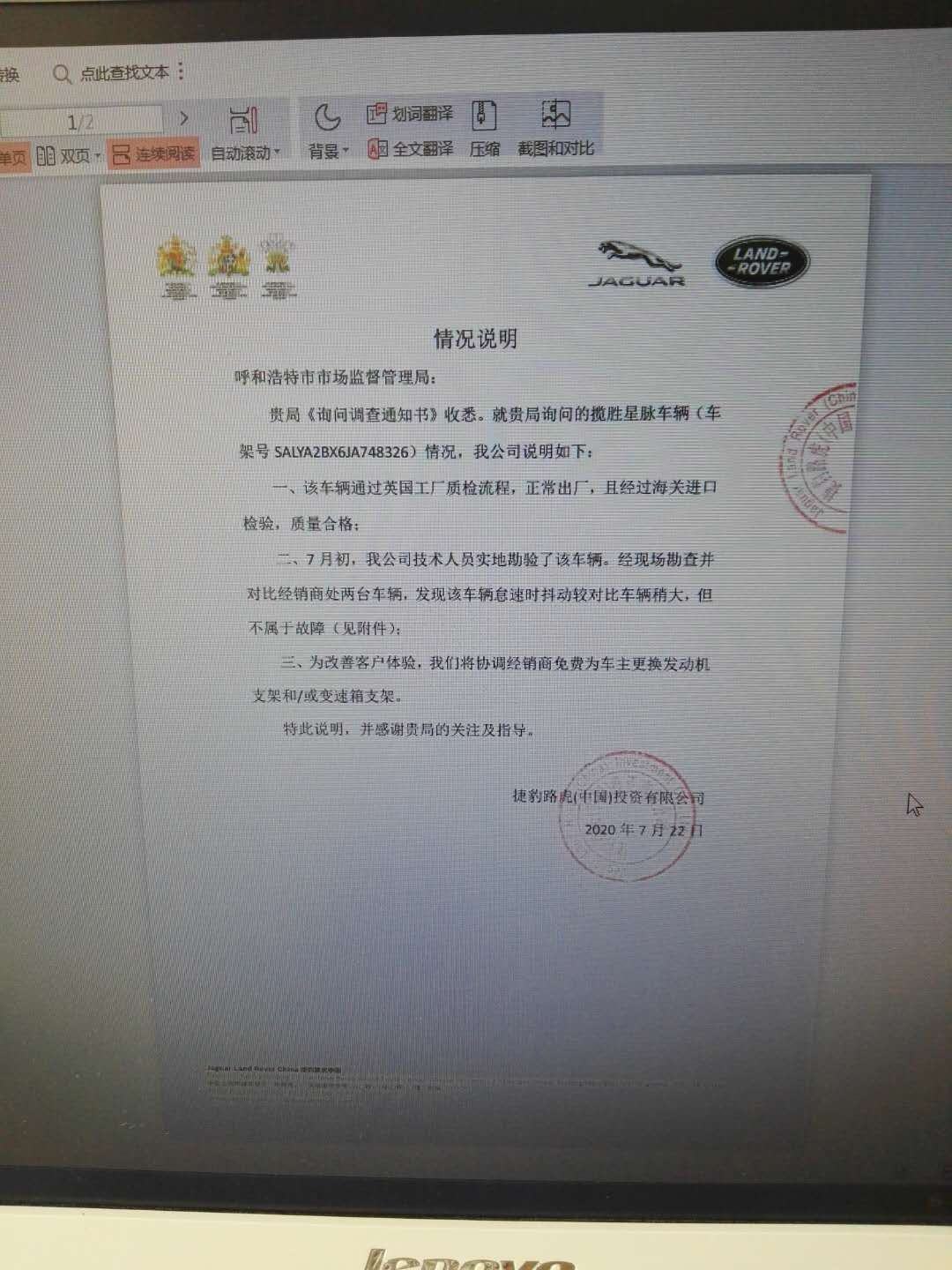 今年5月初,李女士將此事投訴到了呼和浩特市市場監(jiān)督管理局。經(jīng)執(zhí)法人員調(diào)查,李女士反映的情況屬實(shí)。隨后,在執(zhí)法人員的關(guān)注下,路虎總部還派人來查看該車輛,但是堅(jiān)稱該車沒有質(zhì)量問題。此后,該局向路虎總部發(fā)出了《詢問調(diào)查通知書》。7月22日,捷豹路虎(中國)投資有限公司向該局回函稱:“1.該車通過英國工廠質(zhì)檢流程,正常出廠,而且經(jīng)過海關(guān)進(jìn)口檢驗(yàn),質(zhì)量合格。2.7月初,我公司技術(shù)人員實(shí)地勘驗(yàn)了該車輛,經(jīng)現(xiàn)場勘察并且對比經(jīng)銷商(順馳路捷)處兩臺車輛,發(fā)現(xiàn)該車輛怠速時(shí)抖動較對比車輛稍大,但不屬于故障。3.為改善客戶體驗(yàn),我們將協(xié)調(diào)經(jīng)銷商免費(fèi)為車主更換發(fā)動機(jī)支架和/或變速箱支架。”