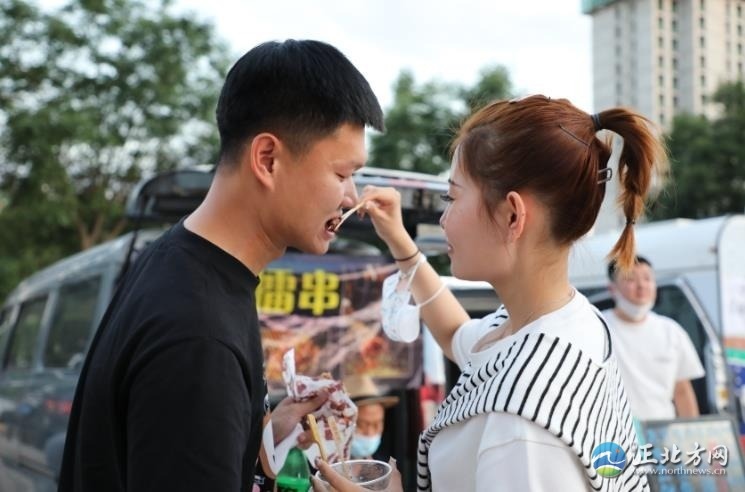 人間煙火氣,最撫凡人心。雖然已是21時許,但是后備廂集市依然人頭攢動,熱鬧非凡,叫賣聲不絕于耳。一家烤腸攤位前,攤主郭浩楠一邊招呼食客,一邊拿著夾子不緊不慢地翻動著烤架上的烤腸,烤好后拿竹簽一穿,伴著滋滋作響的聲音,紅光透亮的烤腸瞬間香氣四溢?!耙呀?jīng)參加了好幾場了,一晚上能售出近百根烤腸,不過我的初衷不是為了賺錢,就是想把自己鐘情的美食分享給大家。”郭浩楠說。