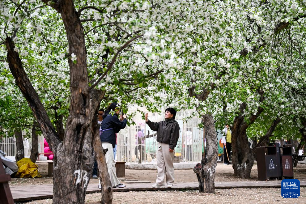5月4日,游客在位于回民區(qū)東烏素圖村的烏素圖杏花谷景區(qū)拍照。