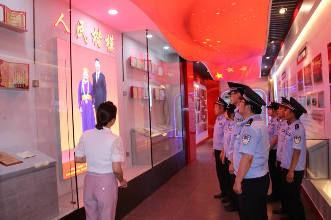 習近平新時代中國特色社會主義思想實踐基地由四子王旗委政府于2021年5月建成,總面積460平米,展廳內展出圖片241張、文字展板34塊、視頻資料12個,分黨史學習教育、都貴瑪先進事跡、新時代文明實踐中心三個展廳,力圖打造成鞏固民族團結大局、鑄牢中華民族共同體意識的紅色教育主陣地。在黨史學習教育展廳,全體黨員民警通過多媒體技術,深入了解了黨的歷次代表大會主要內容、我們黨理論探索的發(fā)展歷程和中國共產(chǎn)黨人的精神譜系以及習近平總書記對內蒙古的重要囑托,重溫了習近平總書記“七一”重要講話精神,引導黨員民警牢記初心使命,時刻銘記黨性是黨員立身、立業(yè)、立德的基石。在都貴瑪先進事跡展廳,大家通過視頻、照片、文字、連環(huán)畫等方式細致了解了“草原母親”都貴瑪養(yǎng)育28名孤兒和挽救40多位產(chǎn)婦的感人事跡,共同回憶了都貴瑪老人與邊防官兵、移民管理警察相處的點點滴滴。大家被都貴瑪老人身上“初心如炬 大愛無疆”的精神深深折服,深切感受到榜樣的力量。在新時代文明實踐中心展廳,大家還了解到駐地四子王旗新時代文明實踐工作的重要舉措和成果,通過對照人民楷模和道德模范,深入開展深刻檢視,進一步強化了黨員民警建設美麗邊疆、維護安全穩(wěn)定的信心決心。
