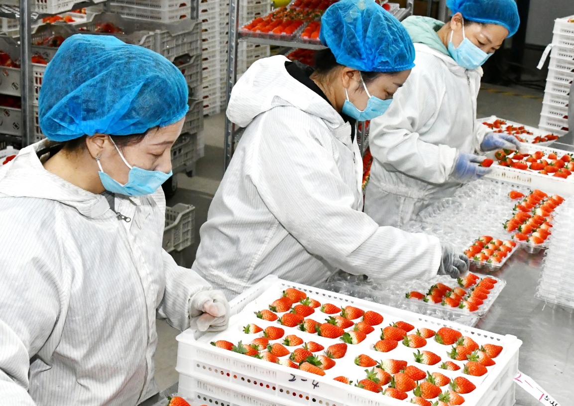 一盒盒新鮮草莓正在裝箱,準備運往各地。 張曉鵬 攝