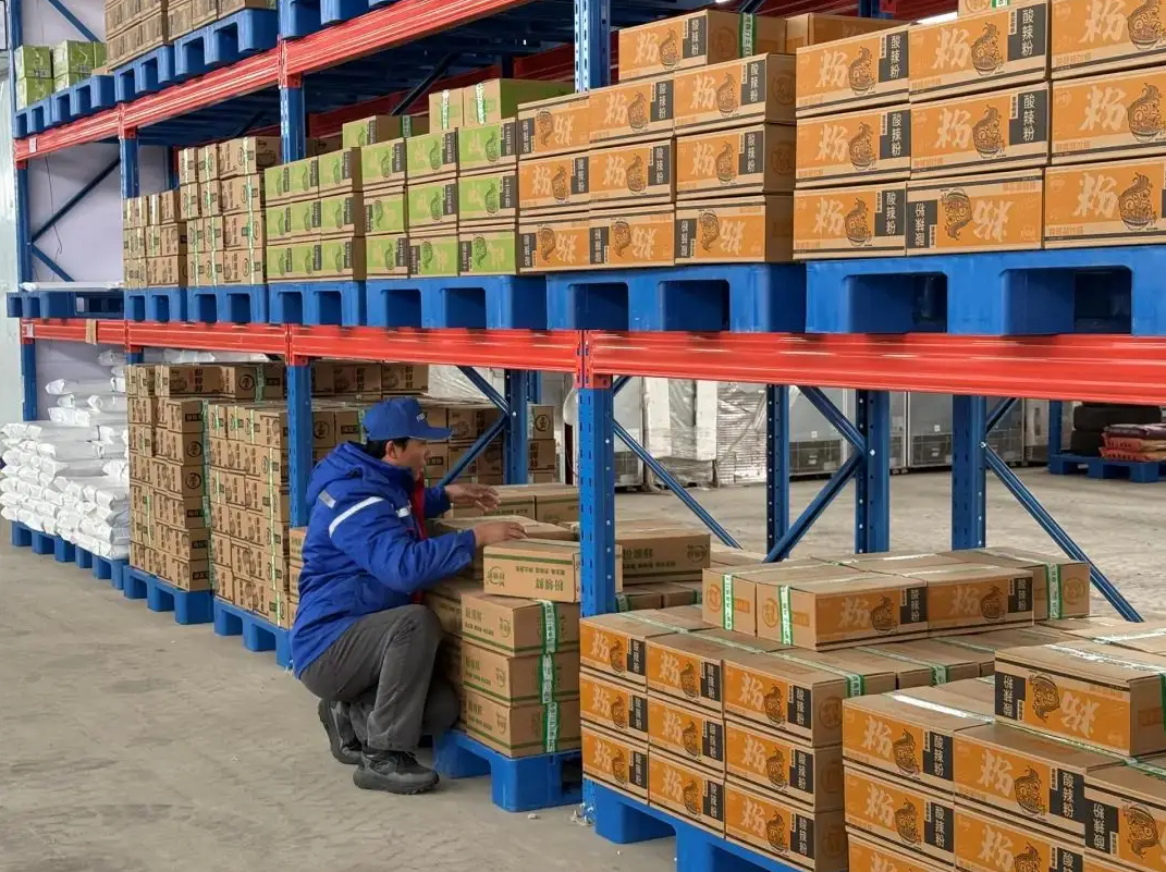這座占地3000平方米的現(xiàn)代化物流樞紐功能齊全:保鮮冷藏區(qū)保障牛羊肉和乳制品的新鮮口感;常溫倉儲區(qū)整齊碼放著大米、沙果干等特產(chǎn);打包區(qū)里工人配合膜包機完成高效分裝。更重要的是,政府持續(xù)給予租金補貼,大大減輕了企業(yè)的倉儲負擔(dān)。