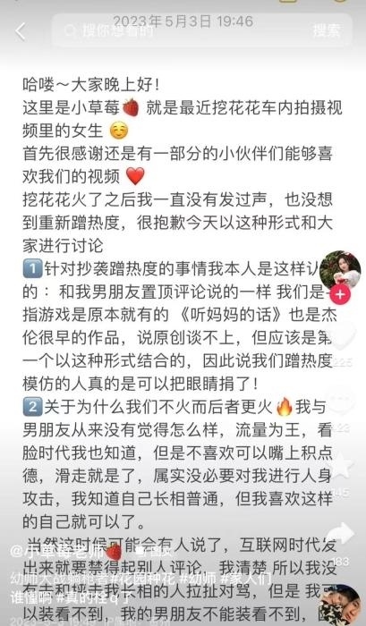 “小草莓老師”也在5月3日發(fā)文回應稱,不存在誰是原創(chuàng)的問題。