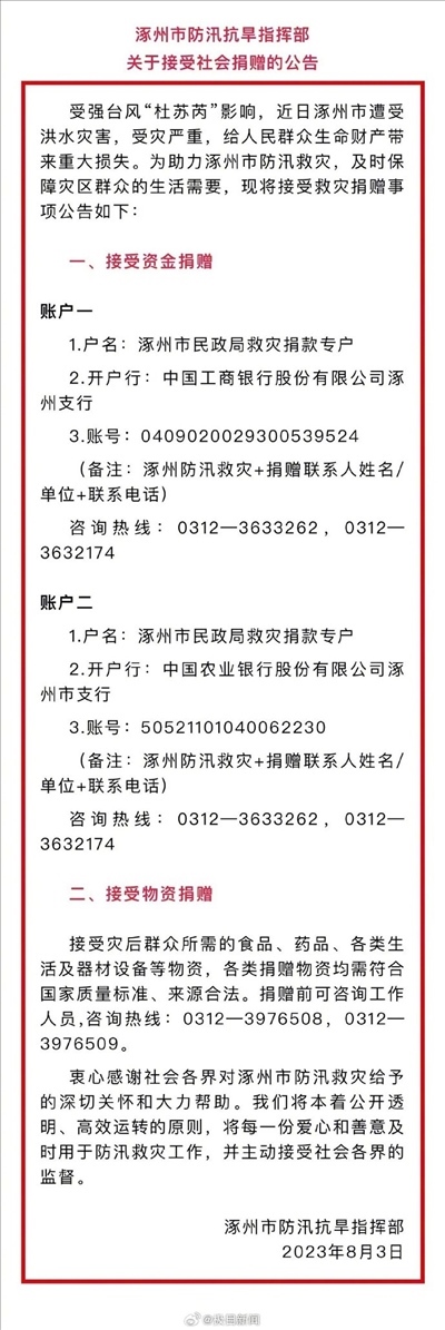 ·河北涿州接受社會捐贈,救災(zāi)捐款專戶公開。