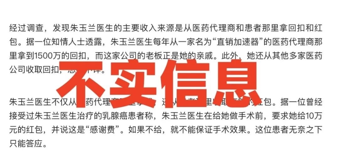 值得一提的是,該文將“抄家1.5億、20套房子”和“朱某某醫(yī)生的主要收入來源是從醫(yī)藥代理商和患者那里拿回扣和紅包”等信息列為“不實信息”,但未否認(rèn)“朱某某被抓”。
