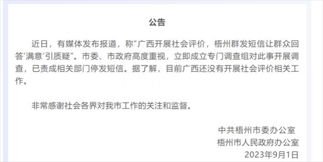 ·網(wǎng)傳廣西開(kāi)展社會(huì)評(píng)價(jià),梧州群發(fā)短信讓群眾回答“滿意”,梧州市政府:開(kāi)展調(diào)查,已責(zé)成相關(guān)部門(mén)停發(fā)短信。據(jù)了解廣西還未開(kāi)展社會(huì)評(píng)價(jià)相關(guān)工作。