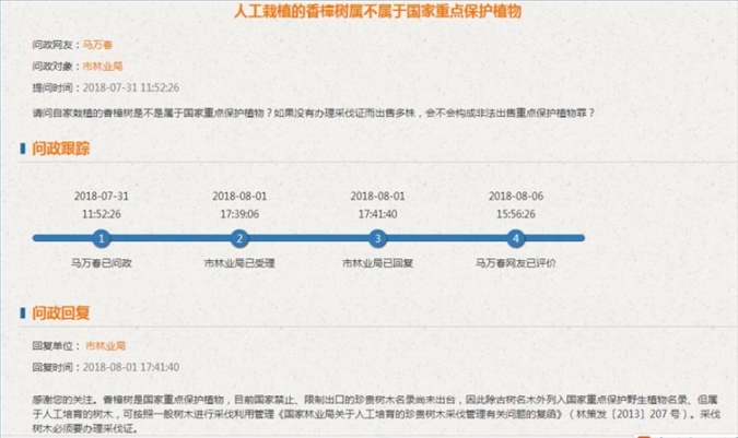 2018年7月,馬萬春通過網(wǎng)絡(luò)問政,得到的瀘州市林業(yè)局的答復(fù)。圖片來源/受訪者供圖