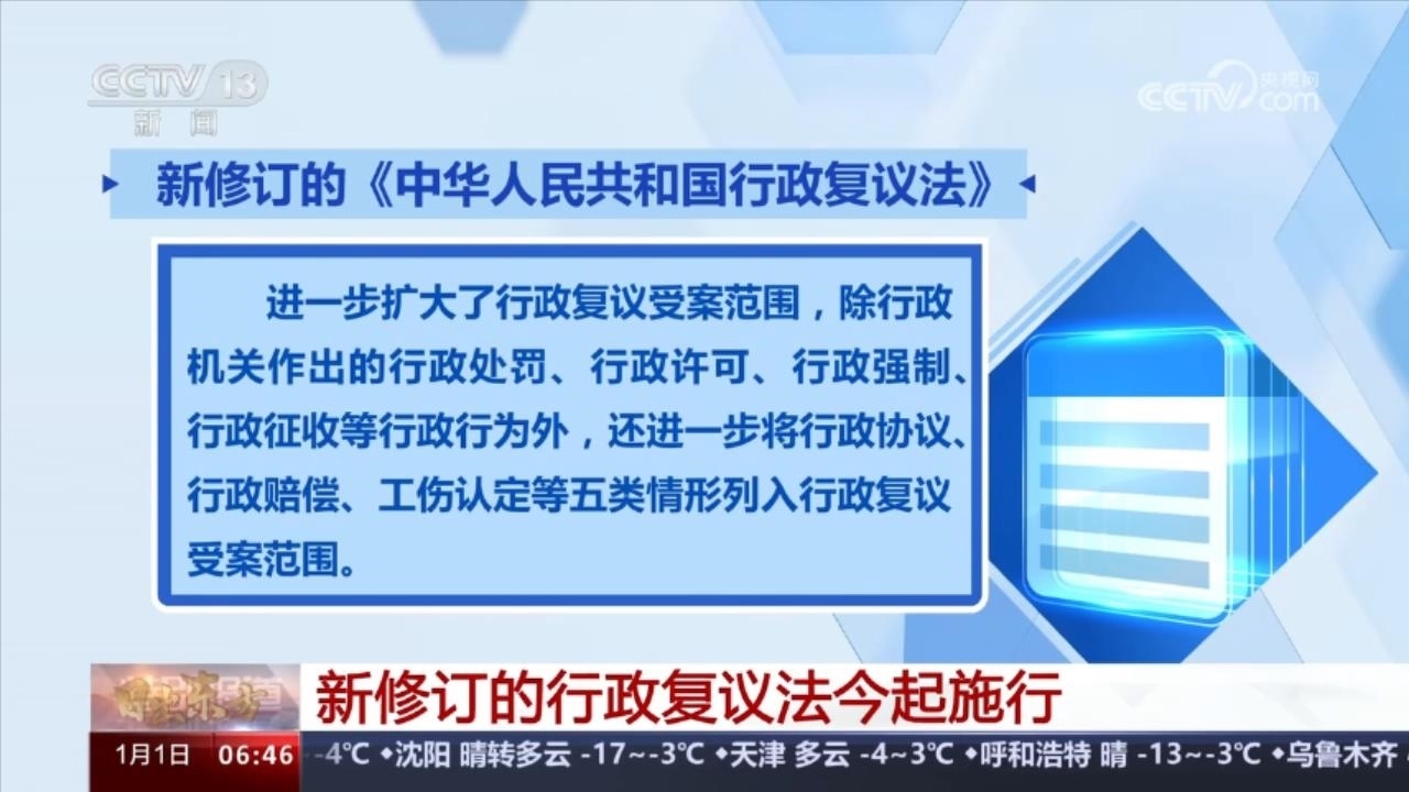 新修訂《中華人民共和國行政復(fù)議法》1月1日起施行,法律進一步擴大了行政復(fù)議受案范圍,除行政機關(guān)作出的行政處罰、行政許可、行政強制、行政征收等行政行為外,還進一步將行政協(xié)議、行政賠償、工傷認(rèn)定等五類情形列入行政復(fù)議受案范圍。