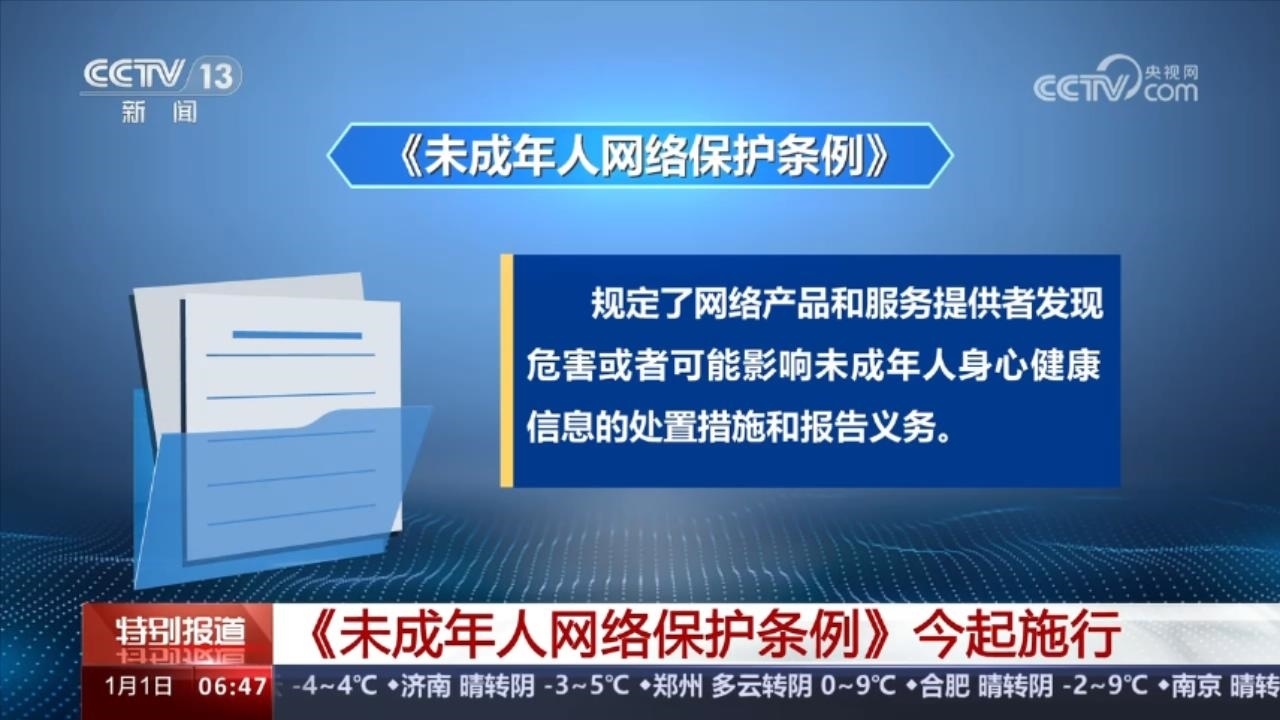 1月1日起施行的《未成年人網(wǎng)絡(luò)保護條例》是我國第一部專門性的未成年人網(wǎng)絡(luò)保護綜合立法。條例規(guī)定,網(wǎng)絡(luò)產(chǎn)品和服務(wù)提供者發(fā)現(xiàn)危害或者可能影響未成年人身心健康信息的處置措施和報告義務(wù)。