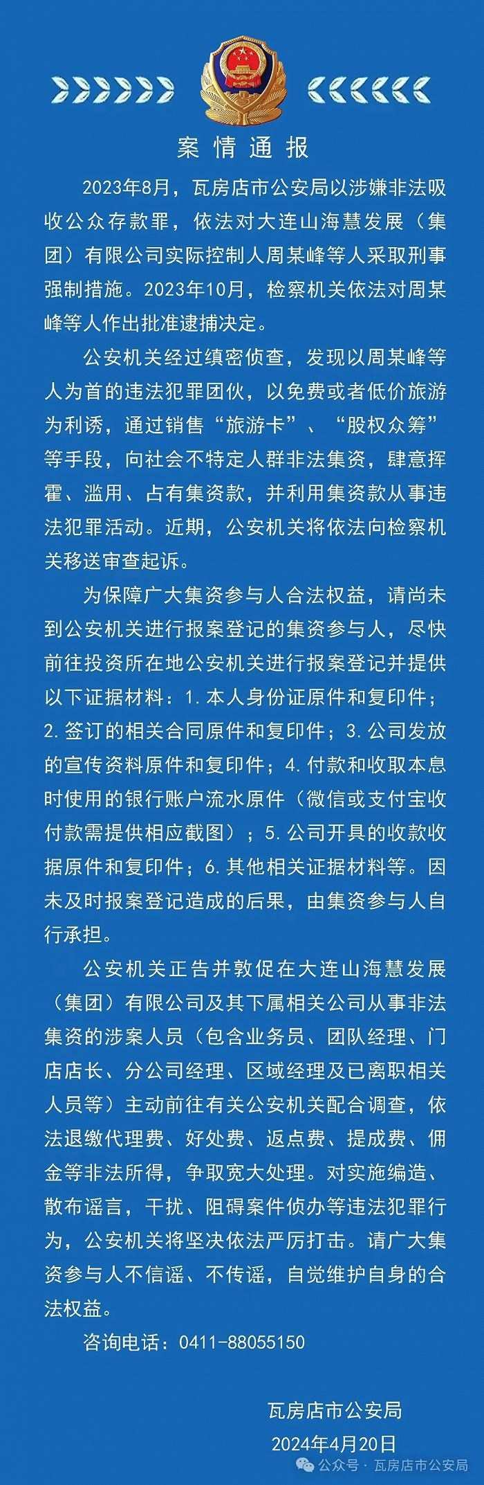 央視網(wǎng)消息:據(jù)瓦房店市公安局官微消息,遼寧瓦房店市公安局通報(bào),2023年8月,瓦房店市公安局以涉嫌非法吸收公眾存款罪,依法對大連山?;郯l(fā)展(集團(tuán))有限公司實(shí)際控制人周某峰等人采取刑事強(qiáng)制措施。2023年10月,檢察機(jī)關(guān)依法對周某峰等人作出批準(zhǔn)逮捕決定。公安機(jī)關(guān)經(jīng)過縝密偵查,發(fā)現(xiàn)以周某峰等人為首的違法犯罪團(tuán)伙,以免費(fèi)或者低價(jià)旅游為利誘,通過銷售“旅游卡”、“股權(quán)眾籌”等手段,向社會(huì)不特定人群非法集資,肆意揮霍、濫用、占有集資款,并利用集資款從事違法犯罪活動(dòng)。近期,公安機(jī)關(guān)將依法向檢察機(jī)關(guān)移送審查起訴。