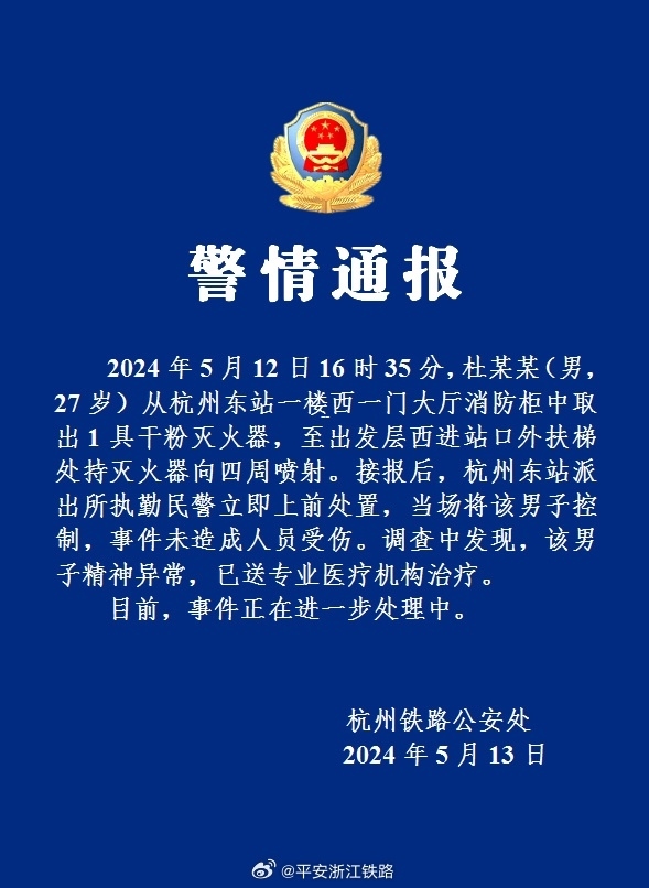 央視網(wǎng)消息:據(jù)“平安浙江鐵路”微博消息,杭州鐵路公安處5月13日通報(bào),2024年5月12日16時(shí)35分,杜某某(男,27歲)從杭州東站一樓西一門大廳消防柜中取出1具干粉滅火器,至出發(fā)層西進(jìn)站口外扶梯處持滅火器向四周噴射。接報(bào)后,杭州東站派出所執(zhí)勤民警立即上前處置,當(dāng)場(chǎng)將該男子控制,事件未造成人員受傷。調(diào)查中發(fā)現(xiàn),該男子精神異常,已送專業(yè)醫(yī)療機(jī)構(gòu)治療。目前,事件正在進(jìn)一步處理中。