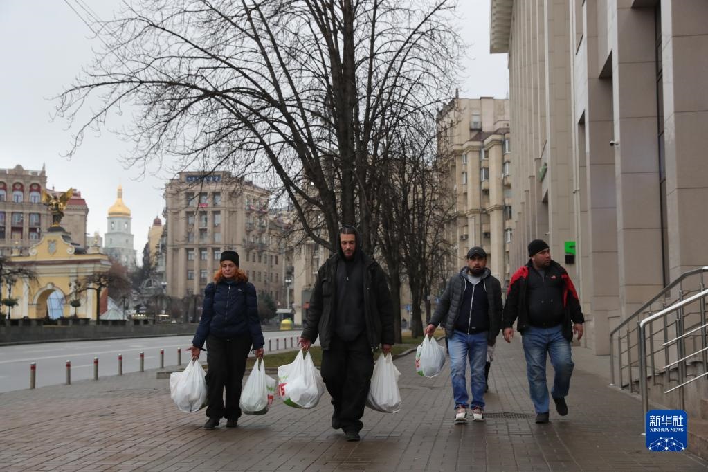 2月24日,在烏克蘭基輔,當?shù)鼐用窳嘀少彽奈镔Y走在街道上。新華社記者 李東旭 攝