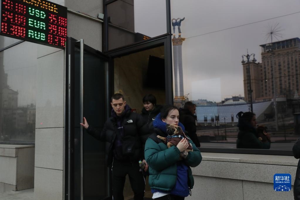 2月24日,在烏克蘭基輔,當?shù)鼐用駨囊惶帗Q匯點離開。新華社記者 李東旭 攝