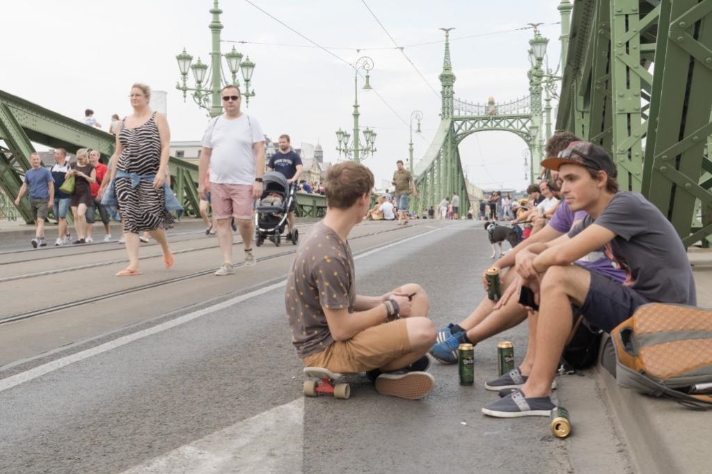 2019年7月21日,人們?cè)谛傺览锥疾歼_(dá)佩斯的自由橋上游玩。新華社發(fā)(弗爾季·奧蒂洛攝)