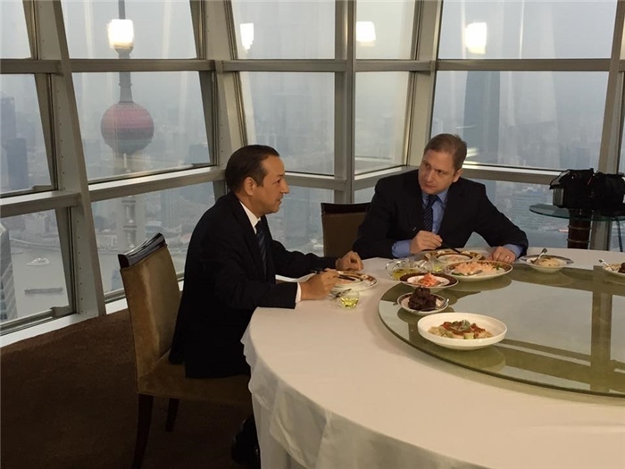 2016年6月,哈考特和香港君悅酒店副總裁理查德·格里夫斯在上海吃飯。圖片來(lái)源:哈考特社媒