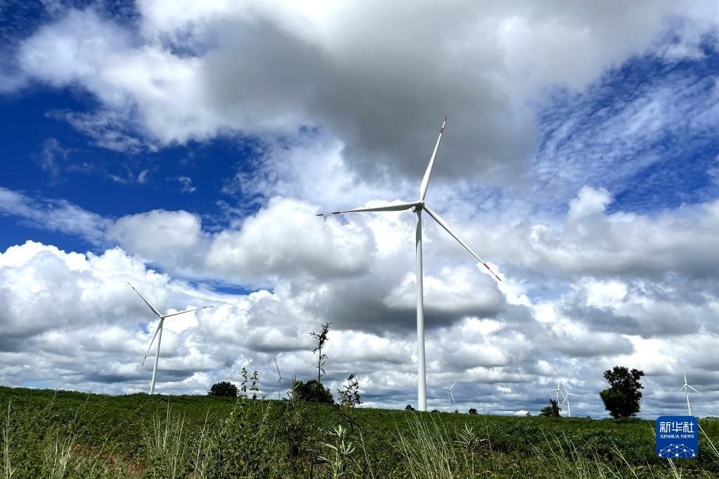 這是2022年10月4日在泰國(guó)猜也蓬府拍攝的由中國(guó)金風(fēng)科技提供的風(fēng)力發(fā)電機(jī)。新華社記者 宋宇 攝