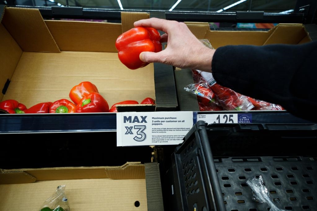 這是2月23日在英國曼徹斯特一家超市拍攝的蔬菜貨架上的限購?fù)ㄖ0凑胀ㄖ?,每名顧客一次只能最多購買3個彩椒。新華社發(fā)(喬恩·休珀攝)