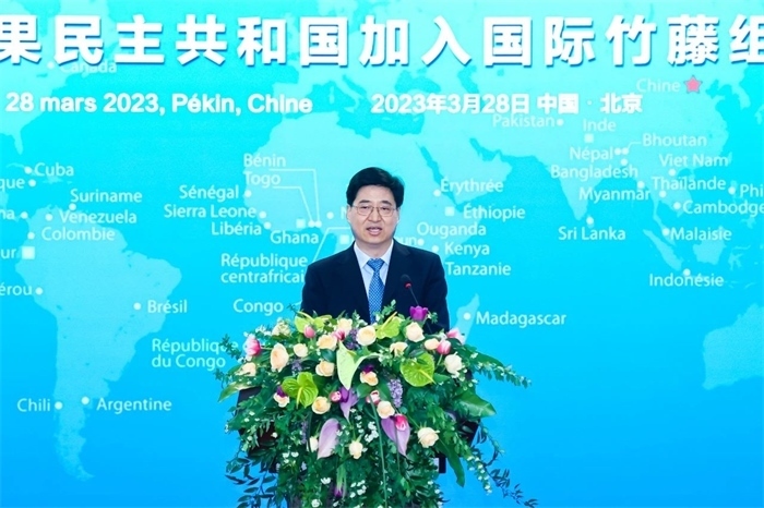 國際竹藤組織理事會主席、喀麥隆林業(yè)和野生動物部部長恩東戈·朱爾·多雷,國際竹藤組織董事會聯(lián)合主席江澤慧,中國外交部國際經(jīng)濟司參贊張雷,中國國家林業(yè)和草原局副局長譚光明,乍得共和國駐華使館代辦馬魯米,剛果民主共和國農(nóng)業(yè)部部長姆津加·比利漢澤·德西雷出席并致辭。