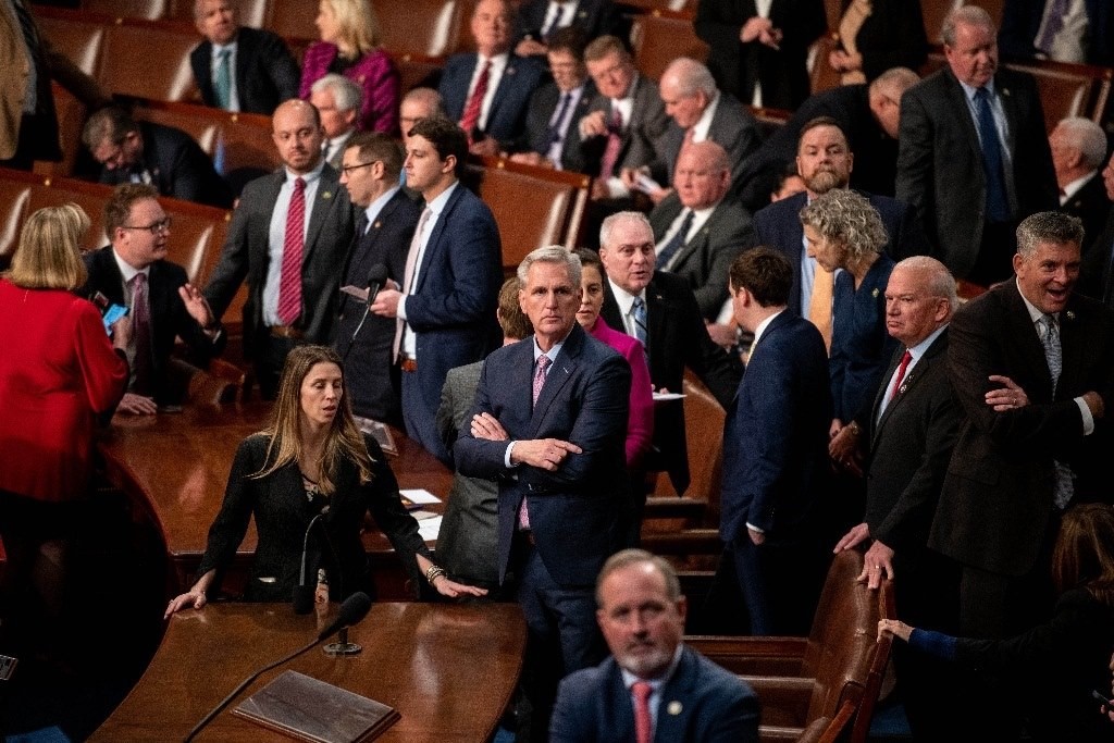 這是1月6日在美國華盛頓國會(huì)拍攝的凱文·麥卡錫(中)。經(jīng)過黨內(nèi)激烈爭(zhēng)論達(dá)成利益交換,共和黨眾議員凱文·麥卡錫于7日凌晨在第15輪眾議院議長選舉表決中當(dāng)選議長。(新華社記者劉杰攝)