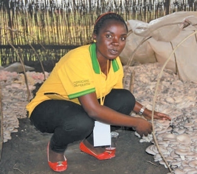 盧旺達國立大學的學生姍臺在菇棚中采收平菇。 中國國家菌草工程技術(shù)研究中心供圖