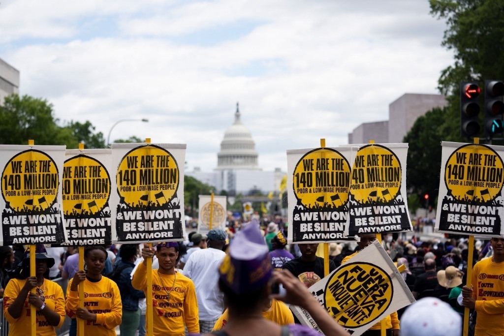 2022年6月18日,來自美國全國各地的數(shù)千民眾在華盛頓國會大廈附近舉行集會,抗議美國根深蒂固的種族歧視以及由此引發(fā)的經(jīng)濟(jì)不公等一系列社會問題。新華社記者劉杰攝
