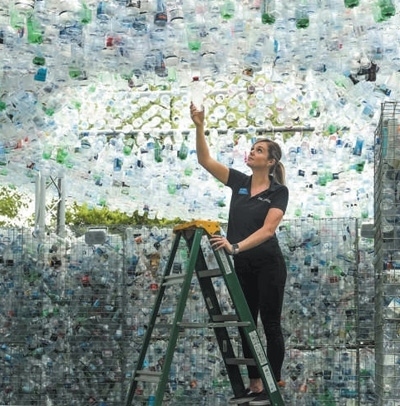 英國藝術(shù)家在倫敦動(dòng)物園打造名為“廢棄物空間”的藝術(shù)裝置,鼓勵(lì)人們停止使用一次性塑料瓶??巳R爾·多赫蒂攝(人民視覺)