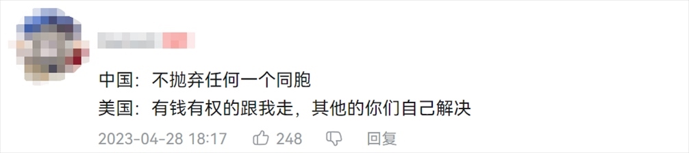 這段視頻引起很多網(wǎng)友的討論,其中有網(wǎng)友簡單總結(jié)了中美撤僑行動的不同。↓