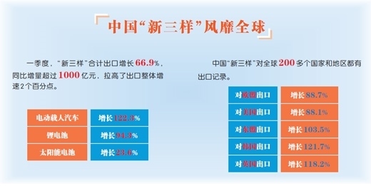 今年一季度,中國外貿(mào)出口逐月向好,實現(xiàn)良好開局。其中,有外貿(mào)“新三樣”之稱的電動載人汽車、鋰電池、太陽能電池表現(xiàn)亮眼,一季度合計出口增長66.9%,同比增量超過1000億元,拉高了出口整體增速2個百分點。