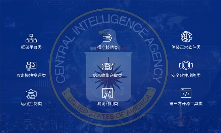 國家病毒應(yīng)急處理中心和360公司通過進(jìn)一步技術(shù)分析發(fā)現(xiàn),盡管CIA的后門程序和攻擊組件大都以無實體文件的內(nèi)存駐留執(zhí)行的方式運行,這使得對相關(guān)樣本的發(fā)現(xiàn)和取證難度極大。即使這樣,聯(lián)合技術(shù)團隊還是成功找到了解決取證難題的有效方法,發(fā)現(xiàn)了CIA所使用的9個類別的攻擊武器,包括攻擊模塊投遞類、遠(yuǎn)程控制類、信息收集竊取類、第三方開源工具類等。