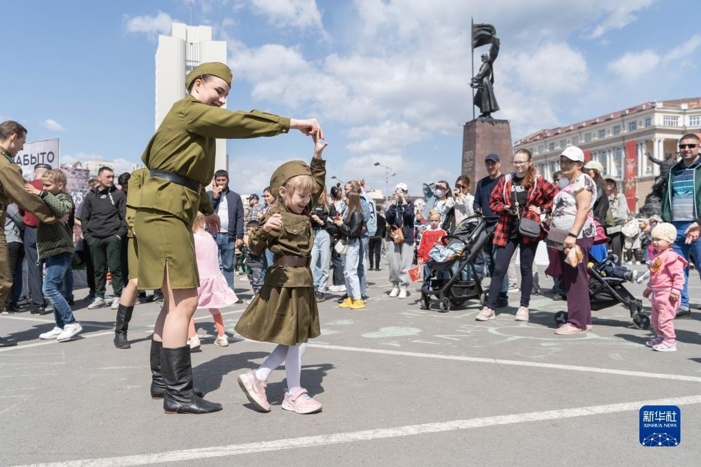 5月9日,在俄羅斯符拉迪沃斯托克,身穿模仿二戰(zhàn)時期蘇軍軍服的市民在廣場上跳舞。
