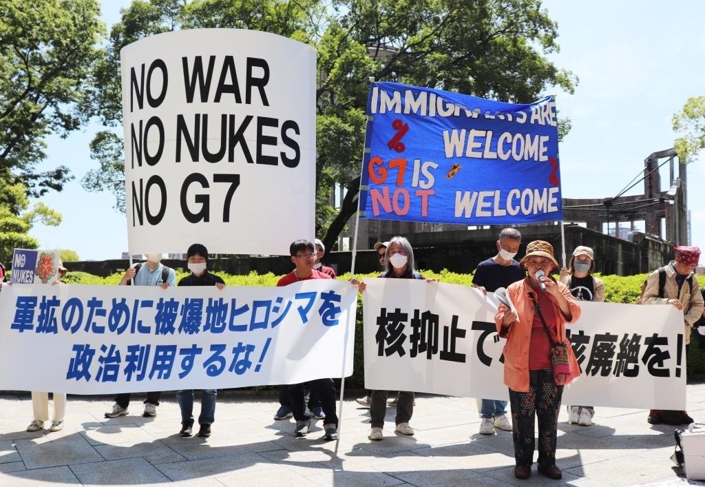 14日,一場(chǎng)更大的抗議活動(dòng)在廣島和平紀(jì)念公園原子彈爆炸遺址前舉行,民眾手舉各式標(biāo)語,高呼“不要G7”“不做戰(zhàn)爭(zhēng)幫兇”等口號(hào),希望喚起政府對(duì)戰(zhàn)爭(zhēng)的反思。