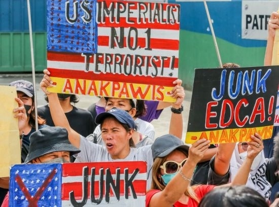 4月11日,在菲律賓首都大馬尼拉地區(qū)奎松城,民眾參加集會活動,抗議菲律賓和美國軍方舉行聯(lián)合軍事演習。新華社發(fā)(烏馬利攝)