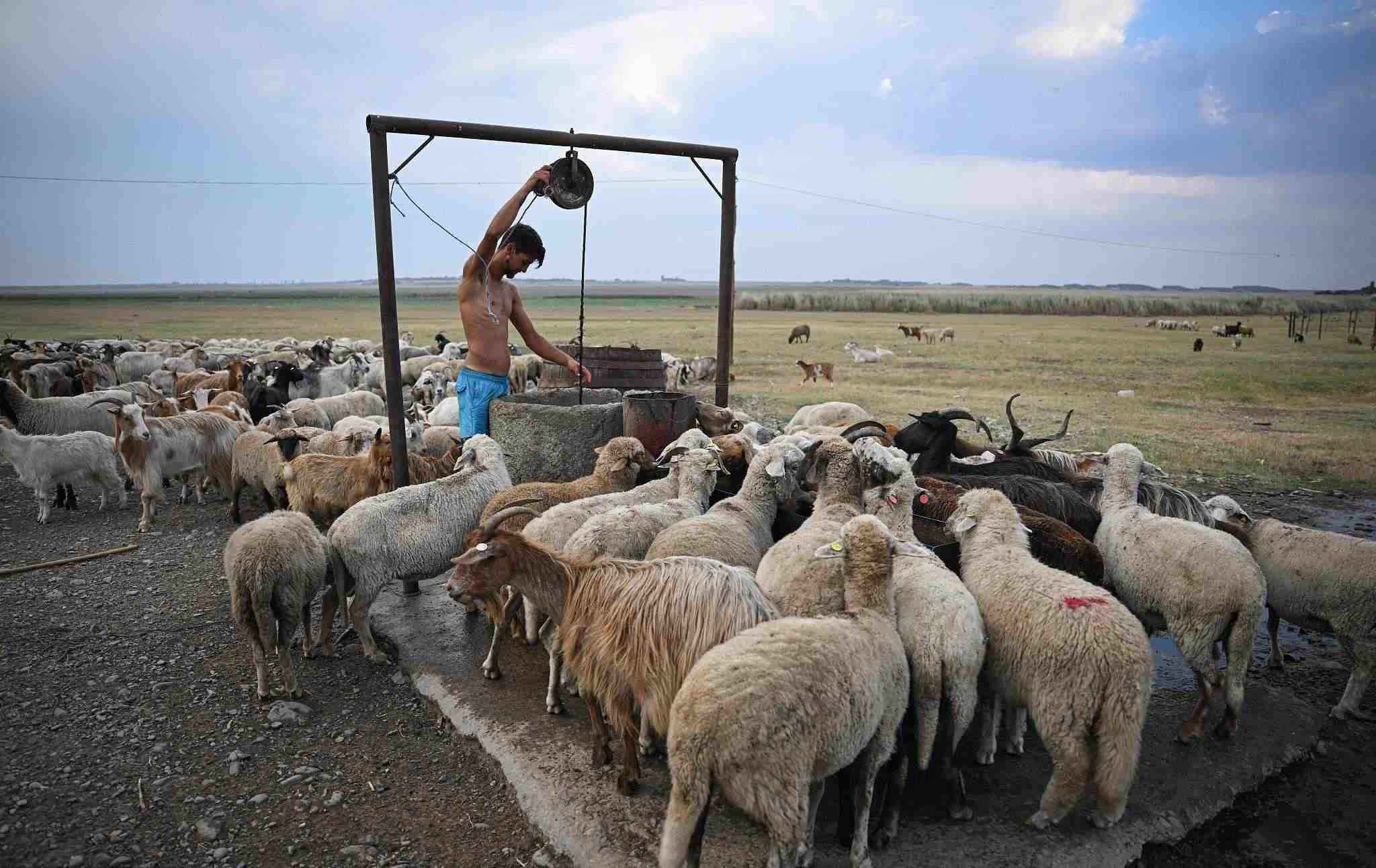 當?shù)貢r間2022年7月28日,羅馬尼亞斯洛博齊亞,牧羊人在阿瑪拉湖床旁的井打水。