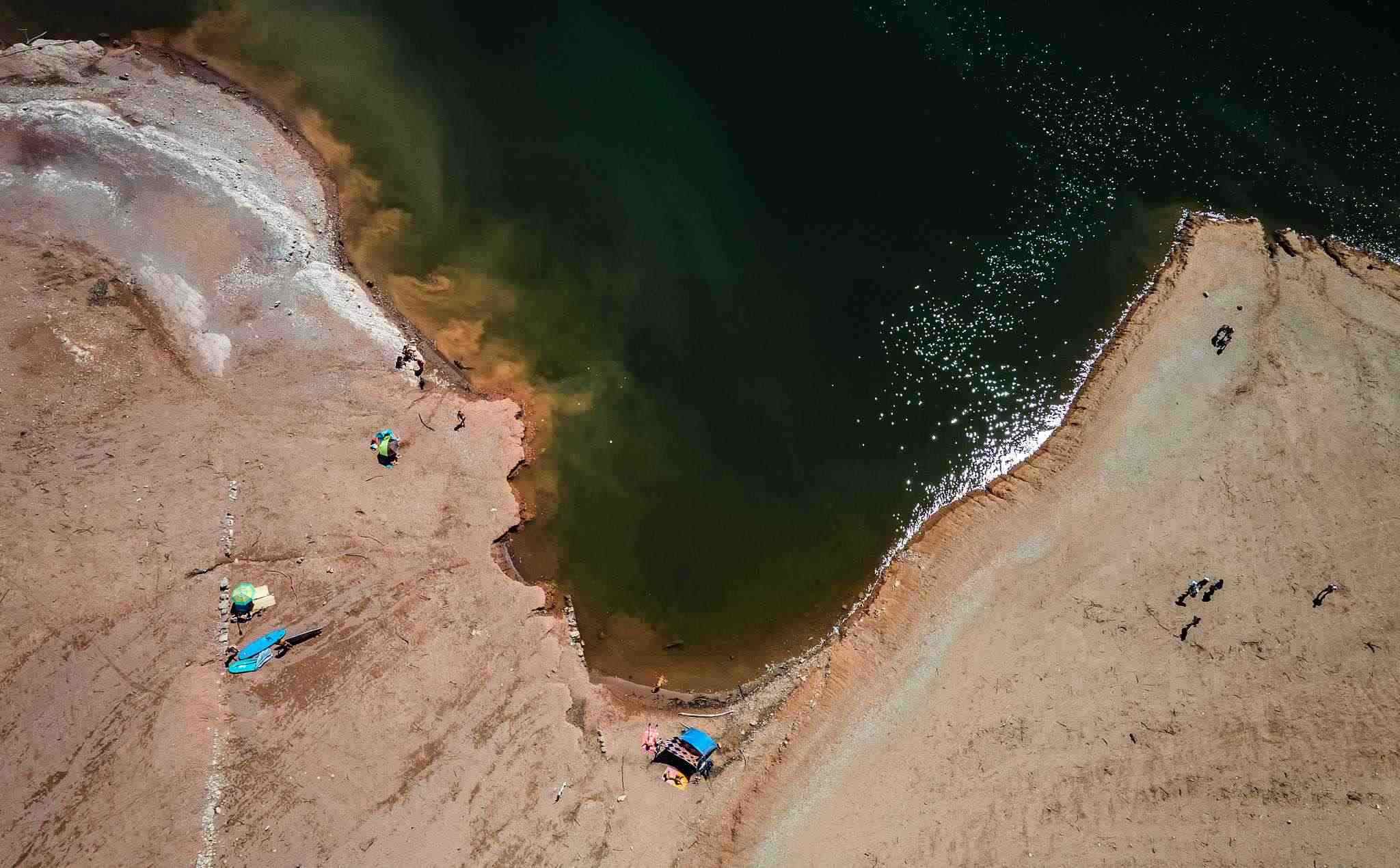 當?shù)貢r間2023年4月16日,美國內(nèi)華達州,棕色的科羅拉多河流經(jīng)水位下降的米德湖。