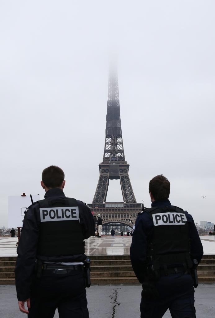 2021年1月27日,警察在法國巴黎埃菲爾鐵塔附近的特羅卡德羅廣場巡邏。新華社記者 高靜 攝