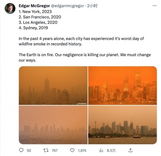 6月7日,紐約市深陷加拿大山火導致的煙霾之時,有網友在社交媒體上列出2019年悉尼、2020年洛杉磯和舊金山、2023年紐約的類似污染畫面,并留言道:“地球在著火”“我們必須作出改變”。