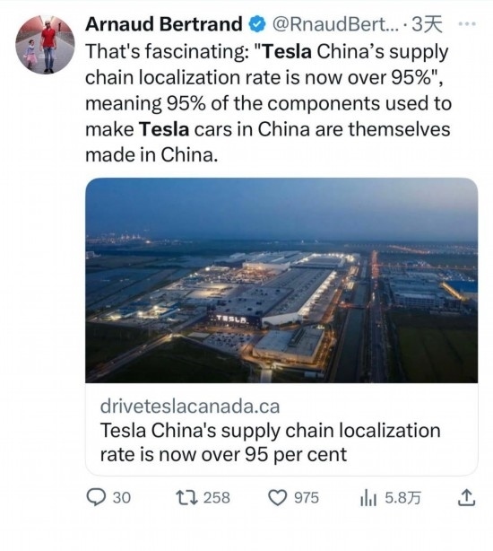 貝特朗還常為中國(guó)發(fā)展“點(diǎn)贊”。他在轉(zhuǎn)發(fā)特斯拉上海超級(jí)工廠新聞時(shí)由衷贊嘆:“真是太厲害了,這表示在中國(guó)生產(chǎn)特斯拉汽車(chē)所用的95%的零部件都是中國(guó)制造?!保▍⑴c記者:陳紹華、張曼;視頻:淡然、王沛;編輯:魯豫、王豐豐、杜逾舸、孫浩)