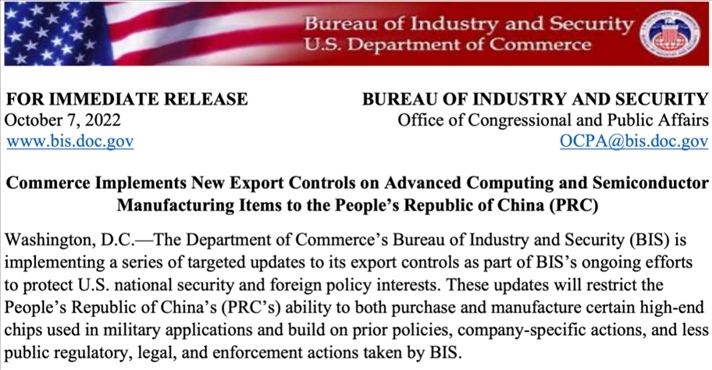 2022年10月7日,美國商務(wù)部工業(yè)和安全局發(fā)布半導(dǎo)體出口管制新規(guī)。圖源:美國商務(wù)部網(wǎng)站