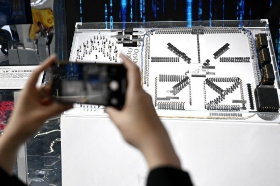 4月26日,觀眾在第二屆中國(guó)(安徽)科技創(chuàng)新成果轉(zhuǎn)化交易會(huì)上拍攝“九章”光量子計(jì)算原型機(jī)模型。新華社記者黃博涵 攝