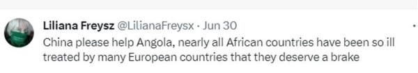 網(wǎng)友利利安娜·弗賴斯直呼:“中國請幫助安哥拉,幾乎所有非洲國家都忍受過歐洲國家的糟糕對待,它們該迎來轉(zhuǎn)機了。”