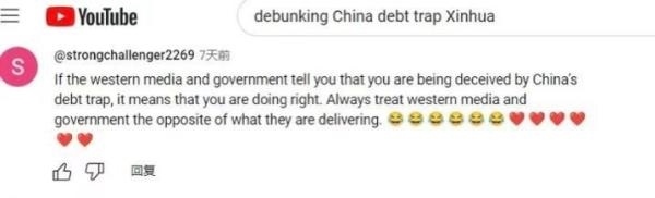 網(wǎng)友“強力挑戰(zhàn)者2269”直言:“如果西方政府和媒體告訴你,你陷入了中國的‘債務(wù)陷阱’,那證明你做對了。對待西方媒體和政府宣傳的信息,你得反著看?!?/p>
