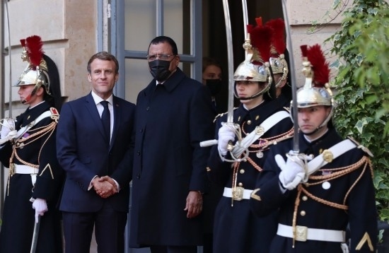 2021年11月12日,在位于法國巴黎的峰會會場,法國總統(tǒng)馬克龍(左二)歡迎尼日爾總統(tǒng)巴祖姆(左三)。新華社記者高靜攝