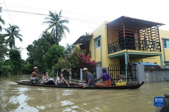 8月12日,在緬甸勃固鎮(zhèn)洪災(zāi)區(qū),人們乘船出行。新華社發(fā)(苗覺(jué)梭攝)