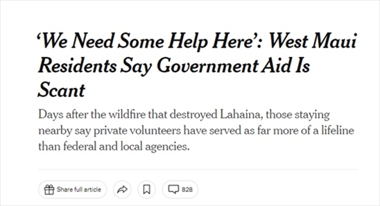 《紐約時報》8月14日報道,聯(lián)邦緊急事務(wù)管理局要求人們在網(wǎng)站上注冊后才能獲得臨時住房等援助,但是毛伊島西部受災(zāi)最嚴重地區(qū)目前依然處于斷電斷網(wǎng)中,那里的災(zāi)民根本無法登錄網(wǎng)站。