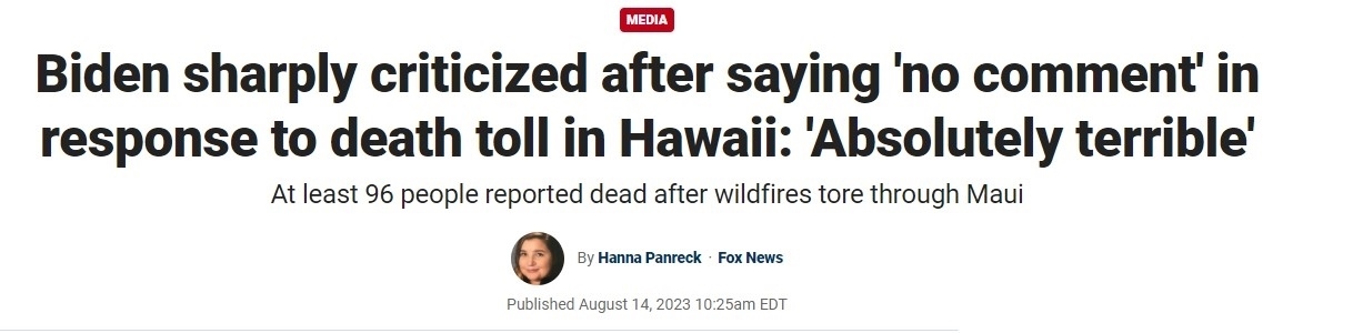 ??怂剐侣劸W(wǎng)8月14日報道稱,當(dāng)?shù)貢r間13日上午,毛伊島救災(zāi)仍在進行,美國總統(tǒng)拜登卻在其位于特拉華州里霍伯斯海灘的海邊別墅過周末。當(dāng)被問及毛伊島大火造成的死亡人數(shù)正不斷上升的問題時,拜登表示“不予置評”。
