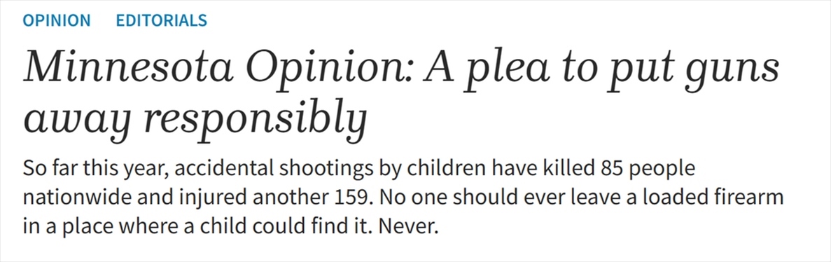 美國KSDK新聞網(wǎng)站報(bào)道稱,根據(jù)美國疾病控制與預(yù)防中心(CDC)的數(shù)據(jù),槍支暴力是導(dǎo)致美國兒童死亡的主要原因,而槍擊很多時候發(fā)生在家里。美國《圣迭戈時報(bào)》(Times of San Diego)網(wǎng)站的報(bào)道也指出,美國大多數(shù)涉及兒童的意外槍擊死亡都是未被鎖起來保存的已上膛槍支造成的。